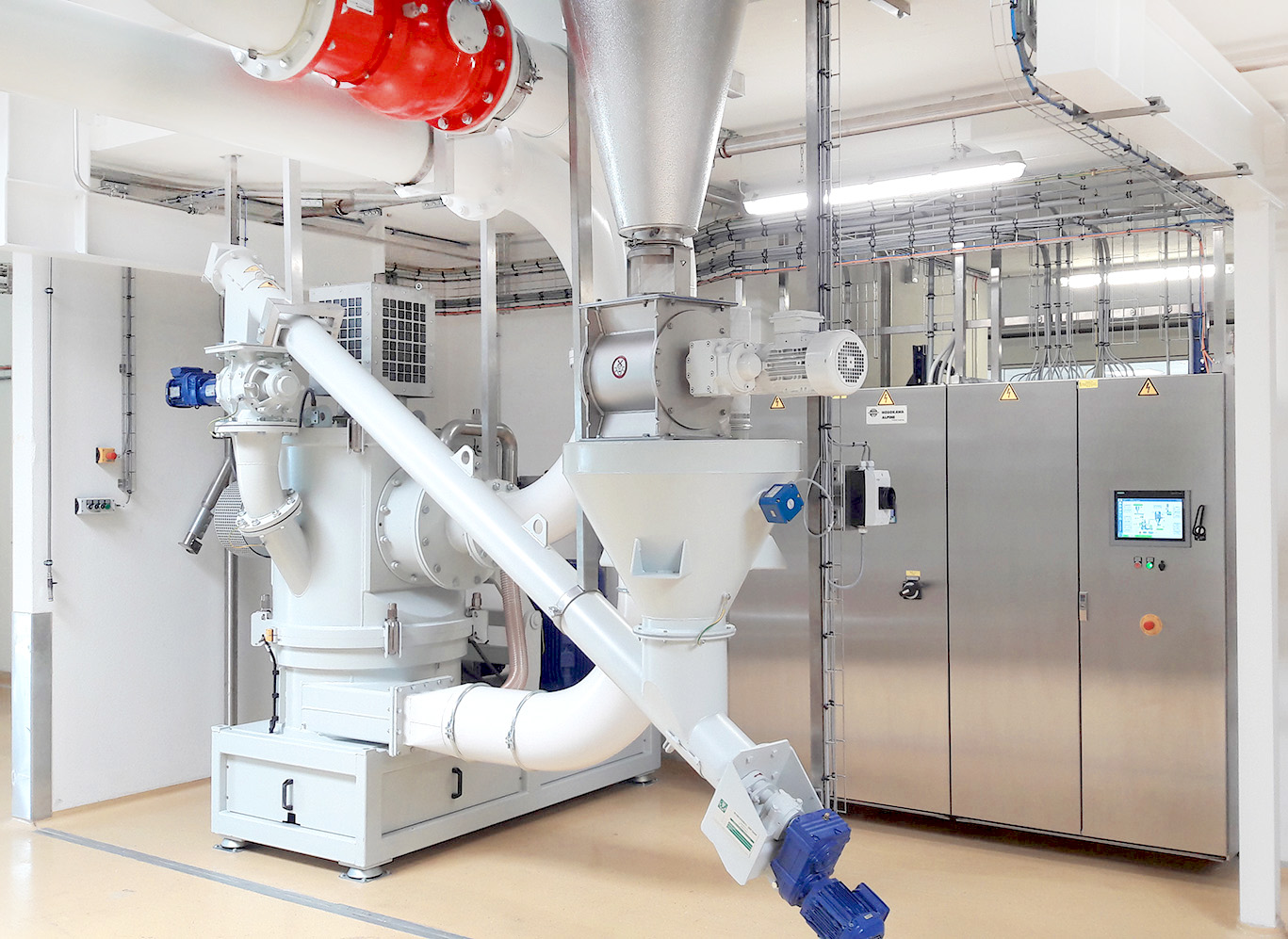 Entscheidend ist, dass das feine Endprodukt explosionstechnisch als ST 1-Produkt zu bewerten ist. Das Mahlsystem ist daher in druckentlasteter Bauweise ausgeführt. Dafür wurde eine flammenlose Druckentlastung installiert. Im Explosionsfall öffnet sich durch die Druckerhöhung die integrierte Berstscheibe und der Druck wird flammlos in den Raum entlastet.