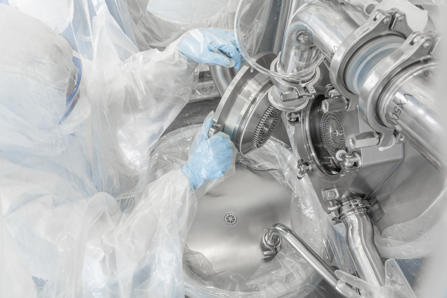 Dabei handelt es sich um Prozessanlagen, die hochgradig für den Betrieb in Isolatoren optimiert sind. Die Isolatoren werden im Unterdruck betrieben, um die kritischen Stellen des Prozesses über alle Prozessphasen sicher bedienen zu können. Über Handschuheingriffe lassen sich manuelle Arbeitsschritte durchführen, z. B. das Be- oder Umfüllen von Gebinden, das Wechseln von Werkzeugen an Prozessmaschinen, aber auch Inspektion oder Reinigung.