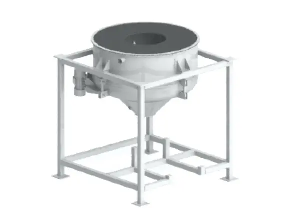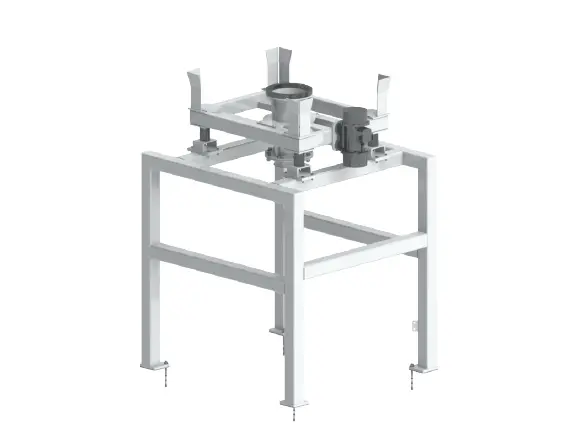 Kostengünstige Lösung: Big-Bag-Aufnahmeschale mit Untergestell. Optionen: Austragshilfe Vibrationstrichter mit Unwuchtmotor oder Walkeinrichtung mit Pneumatikzylinder und Stempel, Auslaufbehälter.