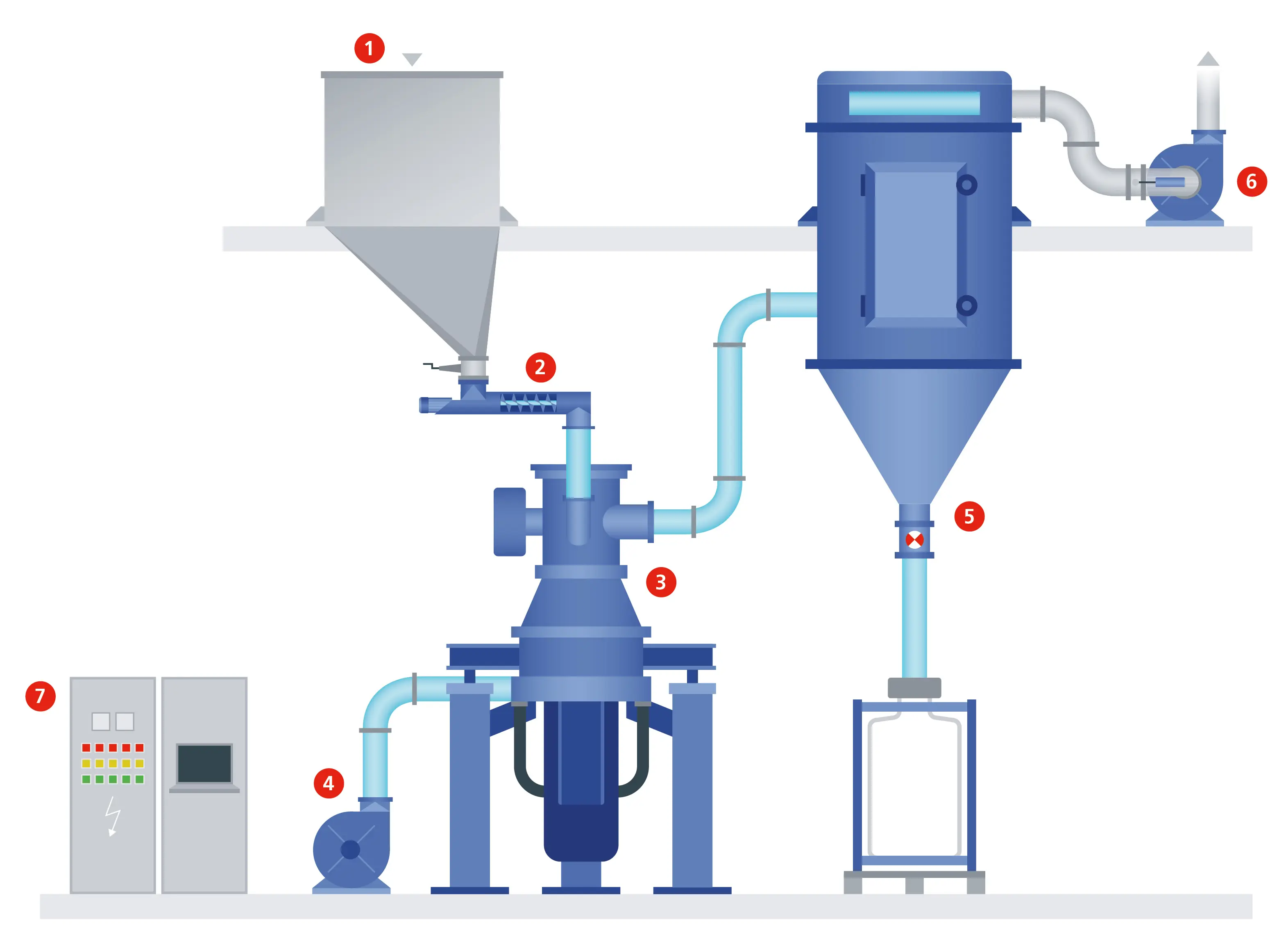 1 Silo 2 Präzise Produktdosierung 3 ALPINE PULVIS 4 Bodenluftgebläse 5 Produktfilter und Verpackung 6 Gebläse 7 Steuerung und Automatisierung