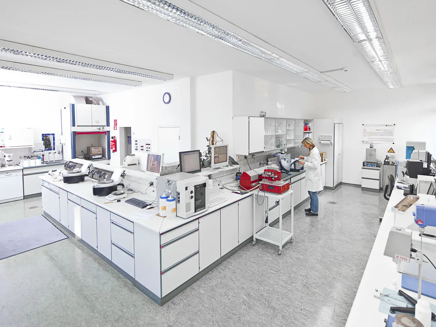 Das hauseigene Prüflabor ist mit den wichtigsten Geräten zur Partikelanalyse (z.B. Luftstrahlsiebung, Nasssiebung, Sedigraph und Laserbeugungsanalyse) ausgerüstet. Dazu kommen Geräte zur Analyse der rheologischen Eigenschaften sowie die Mikroskopie.